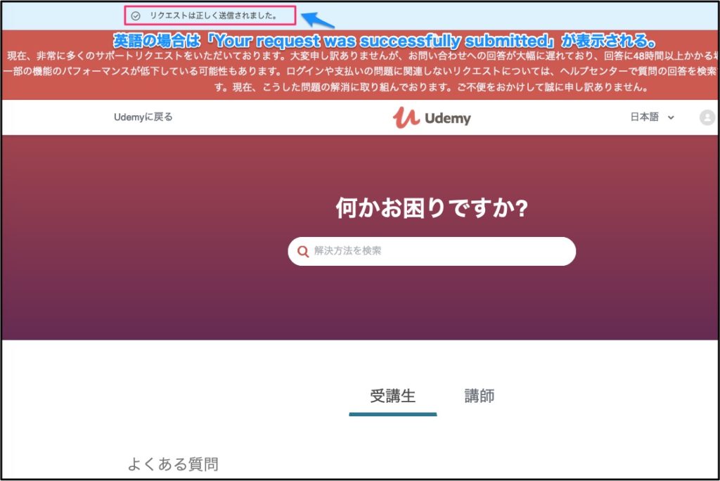 完了画面が英語で表示されているかもしれませんが、その場合は日本語を選択すれば問題なく「リクエストは正しく送信されました」の一言が確認できるはずです。